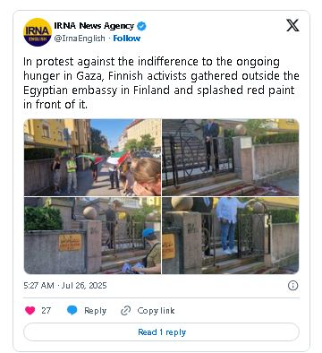 Demonstrations were also held in several cities in Europe. A red spray was sprayed at the Egyptian Embassy entrance in Helsinki, the capital of Finland.
