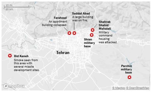 Residents reported massive explosions and Israeli fighter jets over the capital. Iranian state TV showed smoke and fire rising from damaged buildings, including a strike on Saadat Abad street.