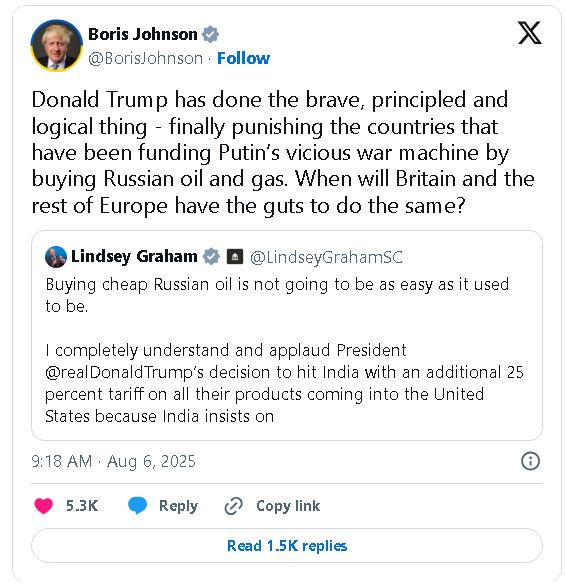London/Washington: Former British Prime Minister Boris Johnson has called US President Donald Trump’s decision to impose an additional 25% tariff on India a “brave and logical” move.